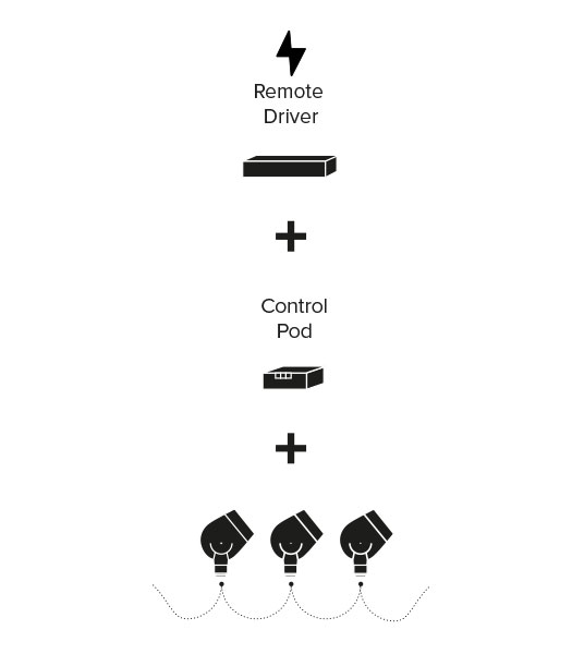 With a single device (Control Pod) that controls up to 64 fixtures, it is possible to dim and manage the colour temperature of the Vader One projector by choosing among three different control systems (DALI, 0/1-10V, DMX), for both multiple and individual configurations. Power supply is via remote driver both in single and multiple configurations (up to 8 fixtures).