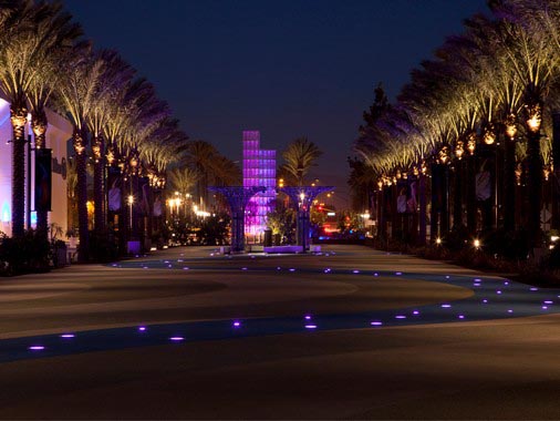 The Grand Plaza represents an enormous transformation of the guest experience at the Anaheim Convention Center and its surrounding hotels. A former throughway for taxis and buses, the roadway has been converted into a large pedestrian mall of over 1,400 feet in length and 120 feet in width. After several workshops with stakeholders including the Convention Center, the City of Anaheim, the Anaheim Hilton and the Anaheim Marriott, lighting design consultancy STUDIOK1, working with the landscape architecture firm RJM, developed a theme for unifying the plaza: The River of Light.Grounded by large fountains on either end of the plaza, the "river" was originally intended to be a water feature extending the 600+ feet between the fountains, representing the Santa Ana River - around which Anaheim was founded - flowing from the mountains to the sea.