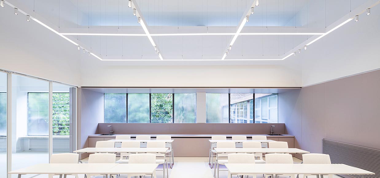 Módulo lineal con proyectores profesionales orientables de LED a instalar como plafón o en suspensión.