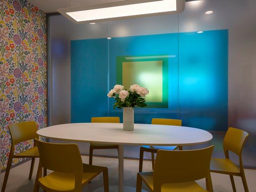 La clínica dental infantil Inwhite Medical de Moscú es un lugar donde se acompaña a los pequeños pacientes a una dimensión lúdica y un recorrido sensorial que estimula su curiosidad y fantasía para alejar el miedo a los tratamientos dentales. Hologramas con retratos de niños sonrientes, nubes textiles que diseñan figuras abstractas de animales, armarios con forma de muñecos de nieve, fotos de reconstrucciones de Lego que reproducen las salas para los tratamientos. La luz y el color desempeñan un papel fundamental creando este clima.